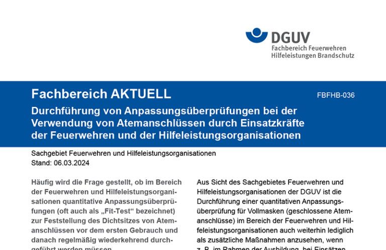 Häufig wird die Frage gestellt, ob im Bereich der Feuerwehren und Hilfeleistungsorganisationen quantitative Anpassungsüberprüfungen (auch als „Fit-Test“ bezeichnet) zur Feststellung des Dichtsitzes von Atemanschlüssen vor dem ersten Gebrauch und danach regelmäßig wiederkehrend durchgeführt werden müssen.